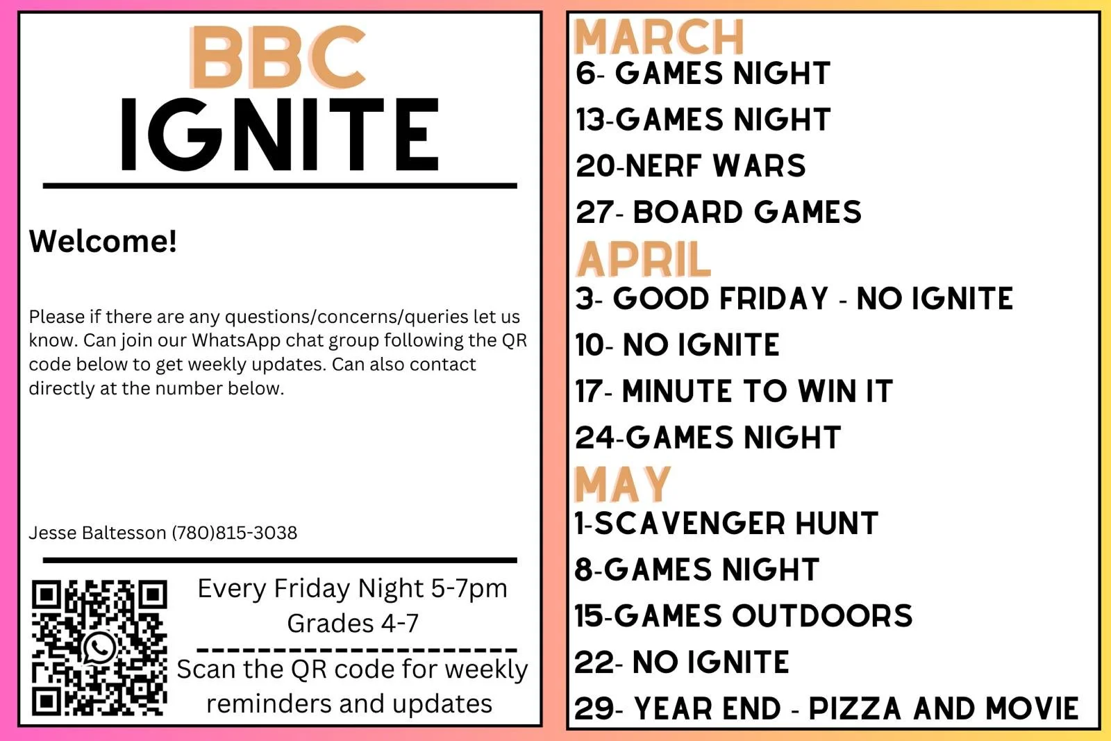 Our Youth Groups are divided by age into two groups; Ignite (Gr 4-7), and Youth Group (Gr 7-12) with each having a time of fun, prayer, and devotional time.